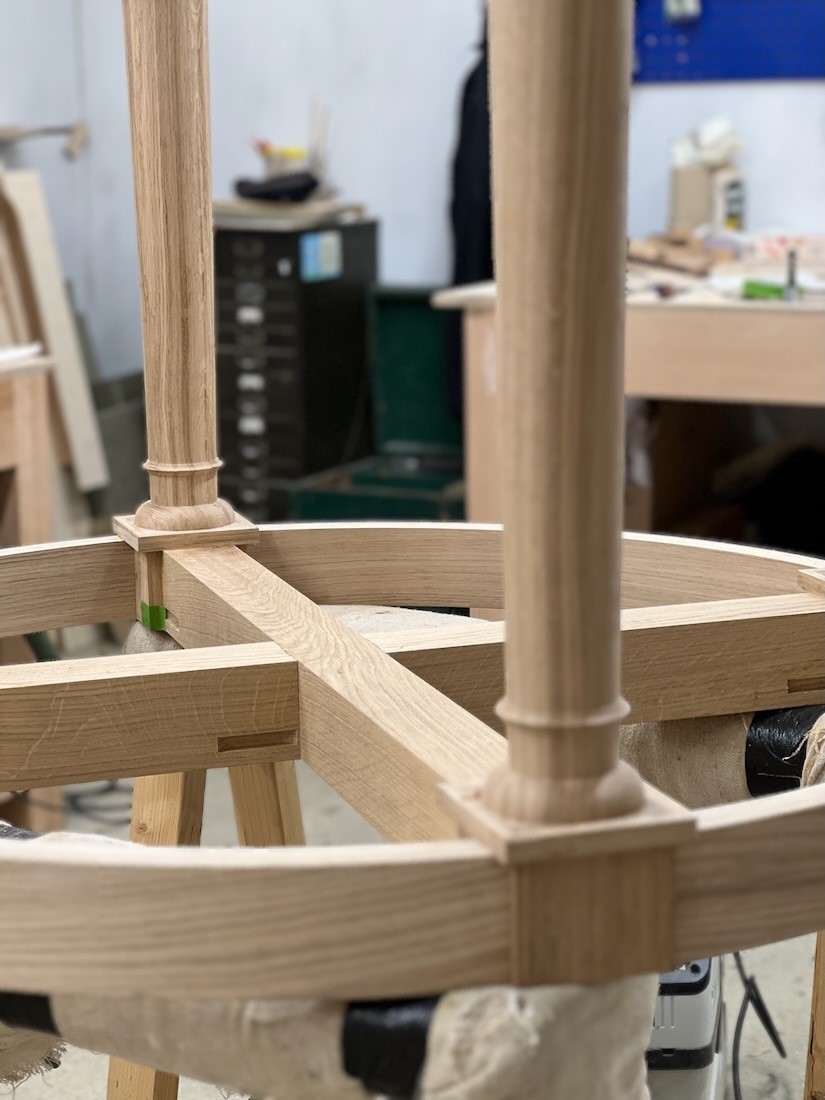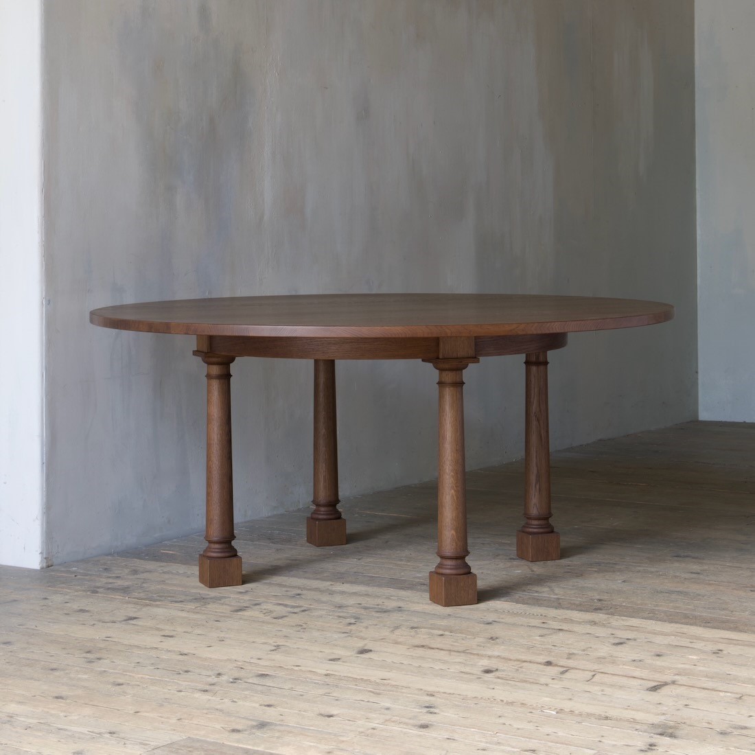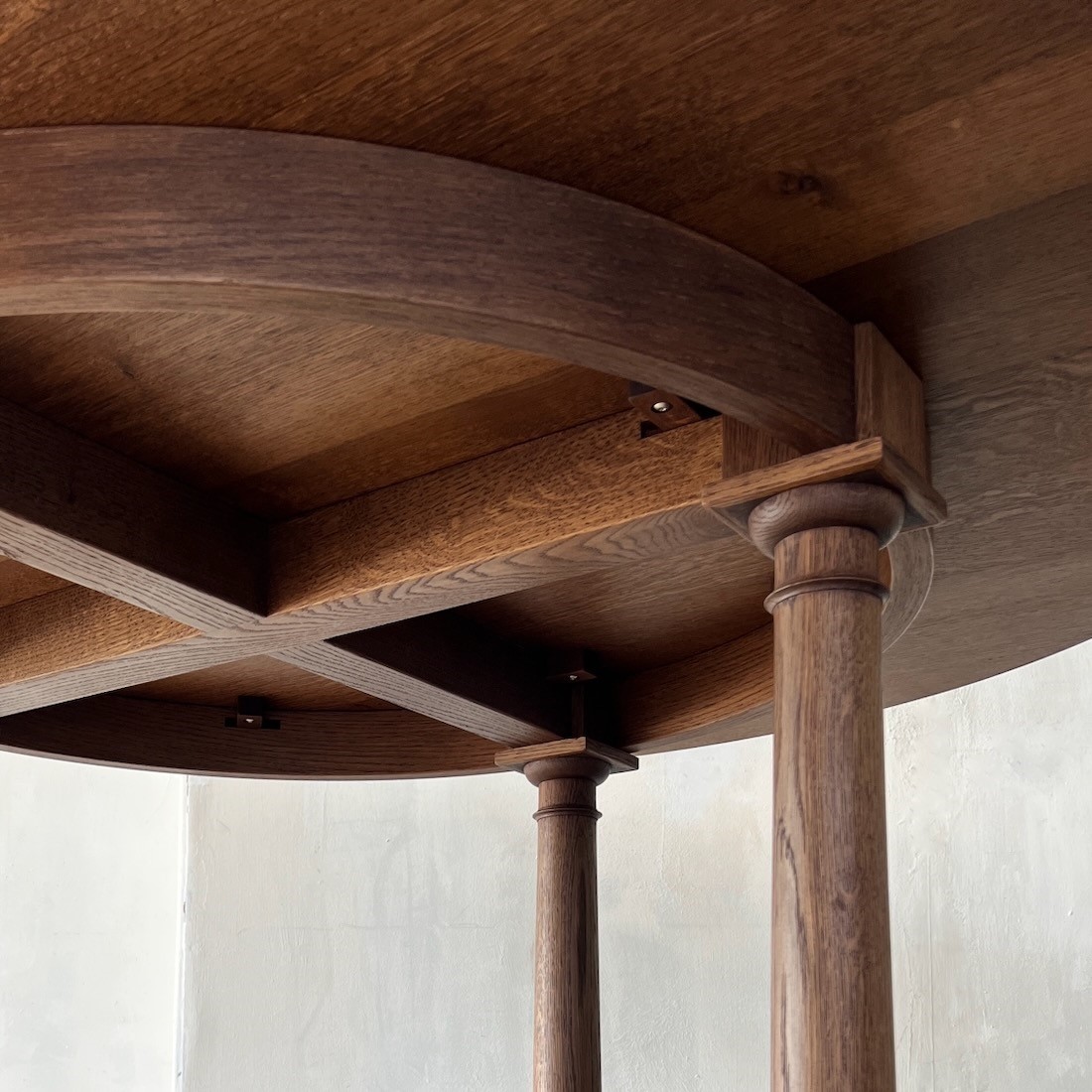 To make the table as practical as possible for dining, we positioned the legs centrally under the table, and dispensed with any stretchers.