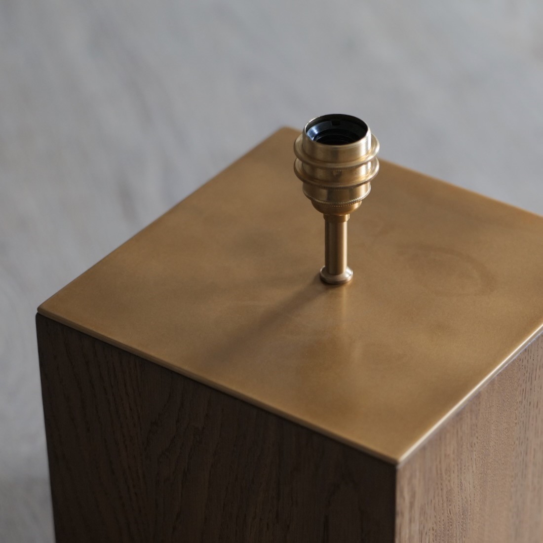 A large-scale cube-shaped oak and brass table lamp with linen shade