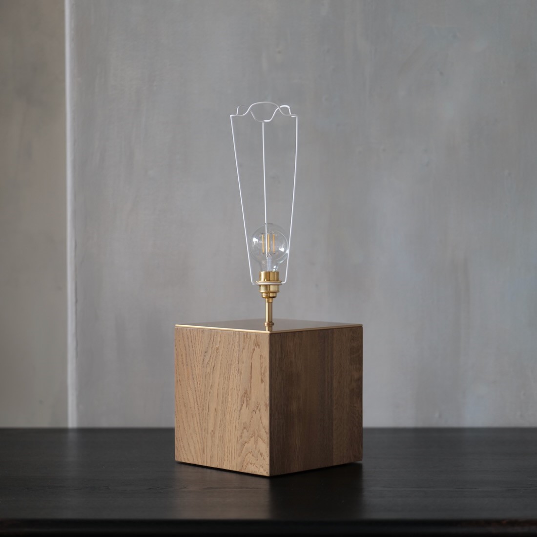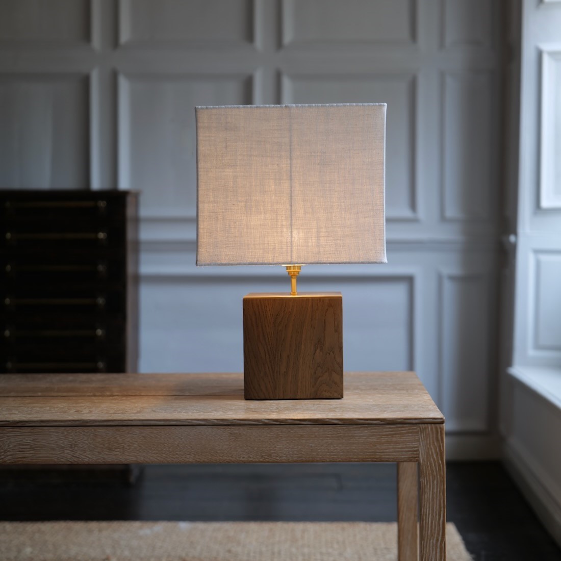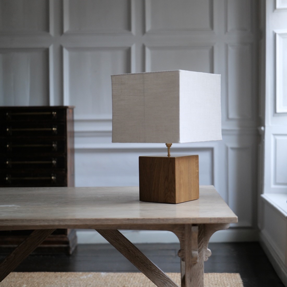 A large-scale cube-shaped oak and brass table lamp with linen shade, designed to be joyful and grounding in equal measure.