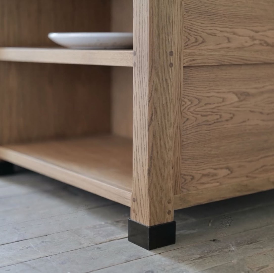 Oak pegs enhance joint strength, and can be drilled out to allow for disassembly if a component needs to be replaced, or if the timber is needed for another purpose one day.