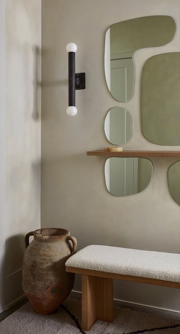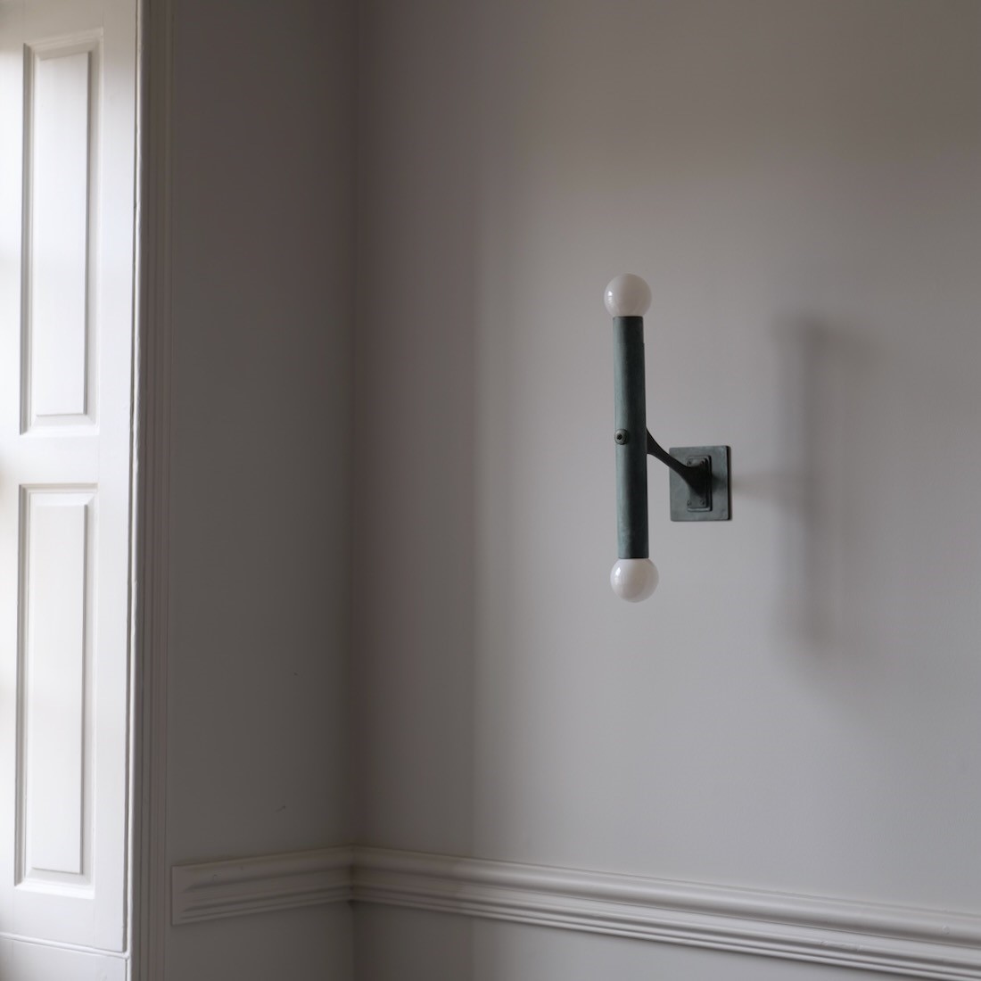 The vesper wall light with our verdigris brass finish and exposed white bulbs.