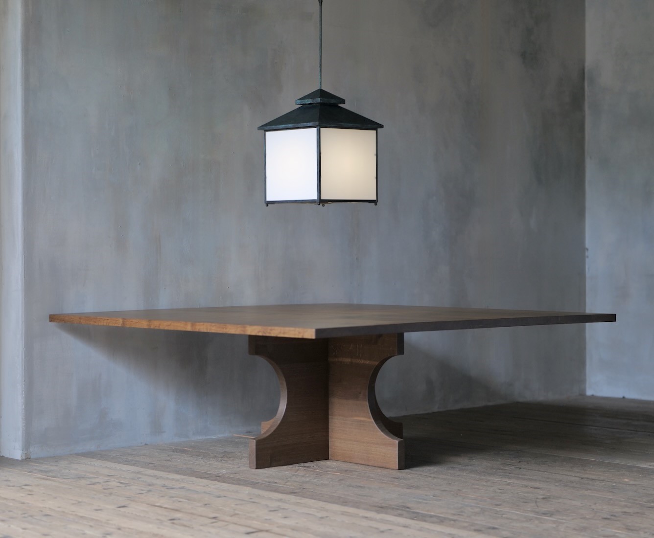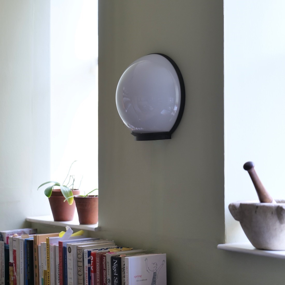 The galley lantern with our verdigris brass finish and white glass. We use a centrally positioned white globe bulb to keep the light temperature consistent and the distribution even.