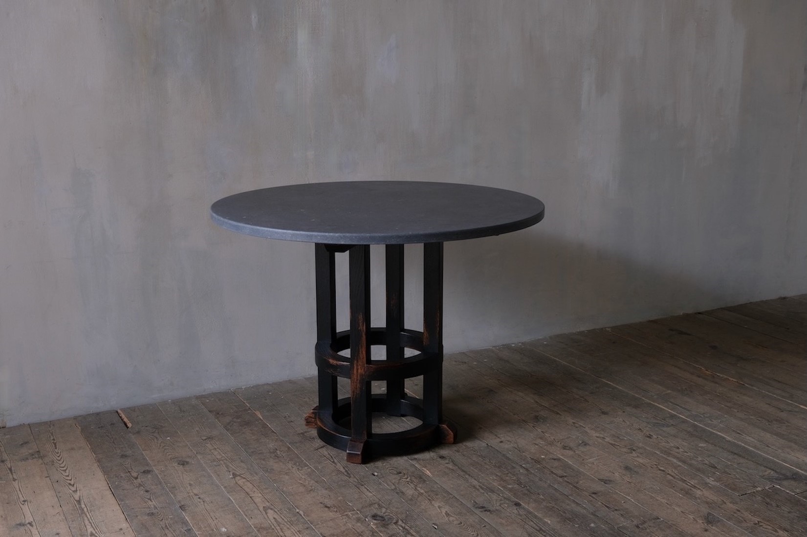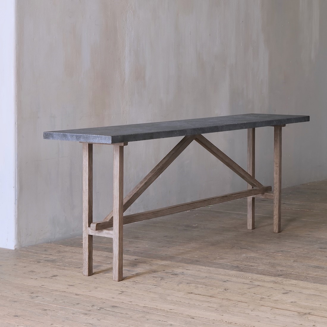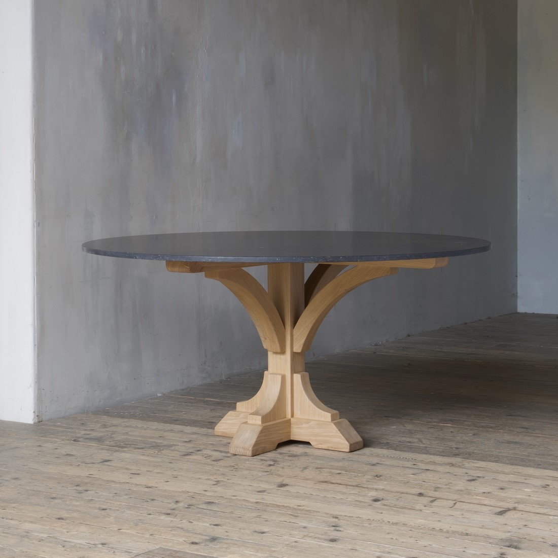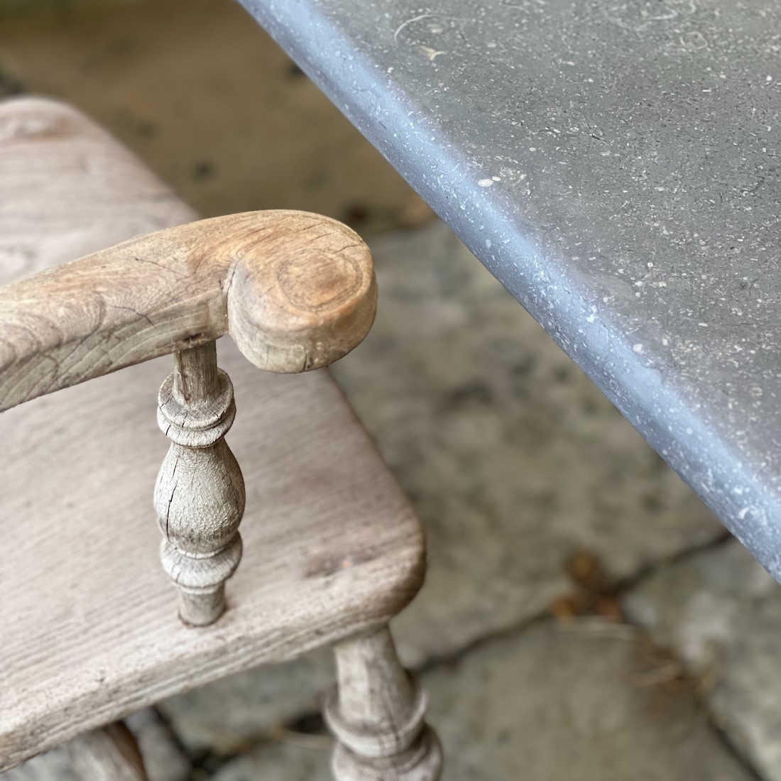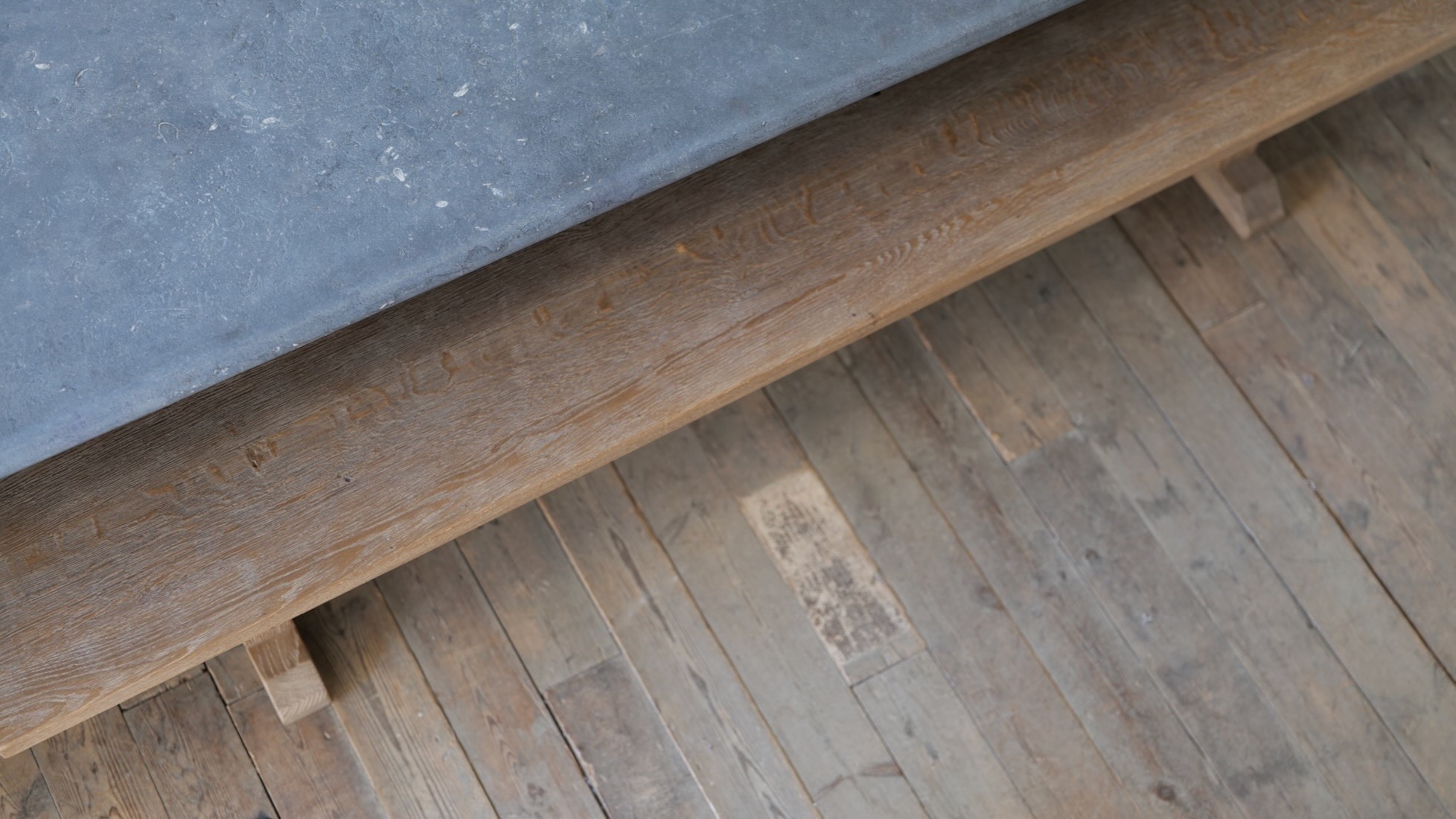 The bluestone of this table top originated when the southern half of present-day Belgium was submerged under a shallow, tropical sea. The marine life you can see as small white fossils, was alive 350 million years ago. The oak tree we made the bench from had been growing for over 200 years. Oak trees have been growing in this way for 50 million years. These wondrous materials come from deep in time, and to our young human race are essentially timeless. Maybe that’s why we feel so grounded when we’re close to them, especially when they have a primitive appearance.